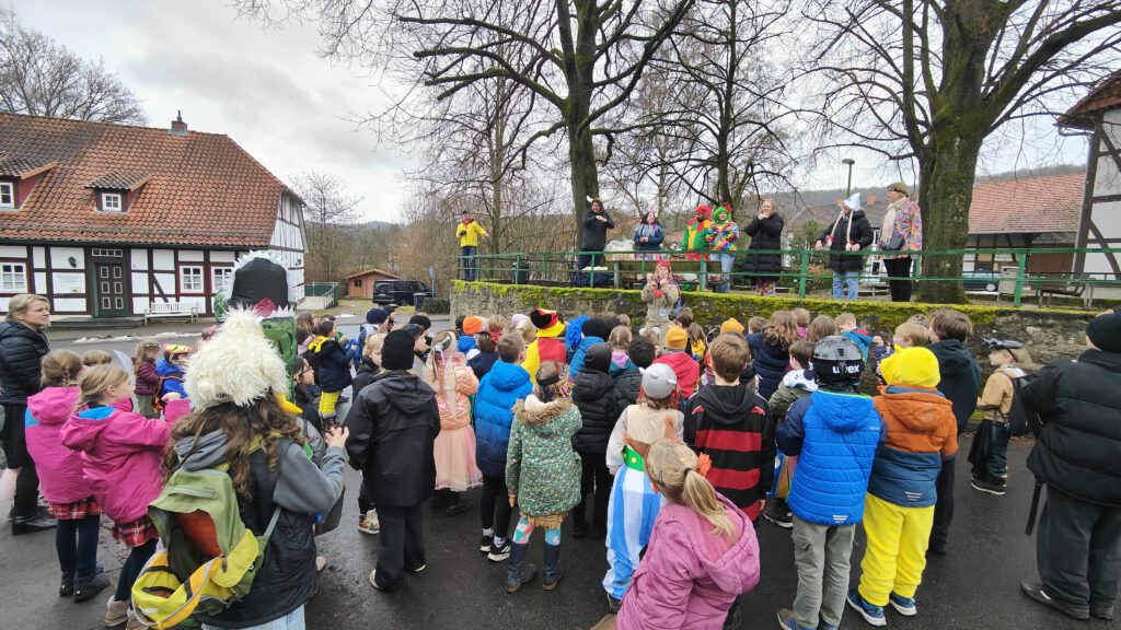 Ein besonderes Highlight war unser großer Umzug durch Herberhausen. Mit Musik, guter Laune und viel Helau zogen wir gemeinsam durch den Ort. Am Thie wartete dann die mittlerweile traditionellle süße Überraschung: Die Elternvertreterinnen und Elternvertreter des Fördervereins empfingen uns mit Musik, Tanz und einem fröhlichen Kamelle-Werfen. Begeistert sammelten die Kinder die geworfenen Süßigkeiten ein – ein rundum gelungener Abschluss unseres Faschingsumzugs.